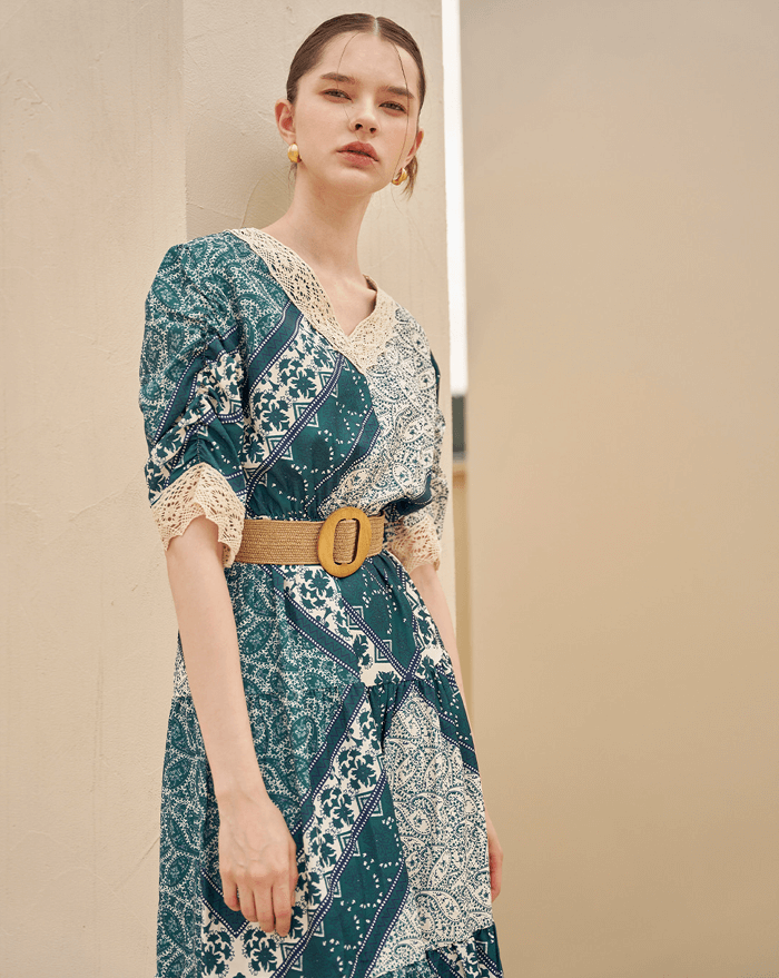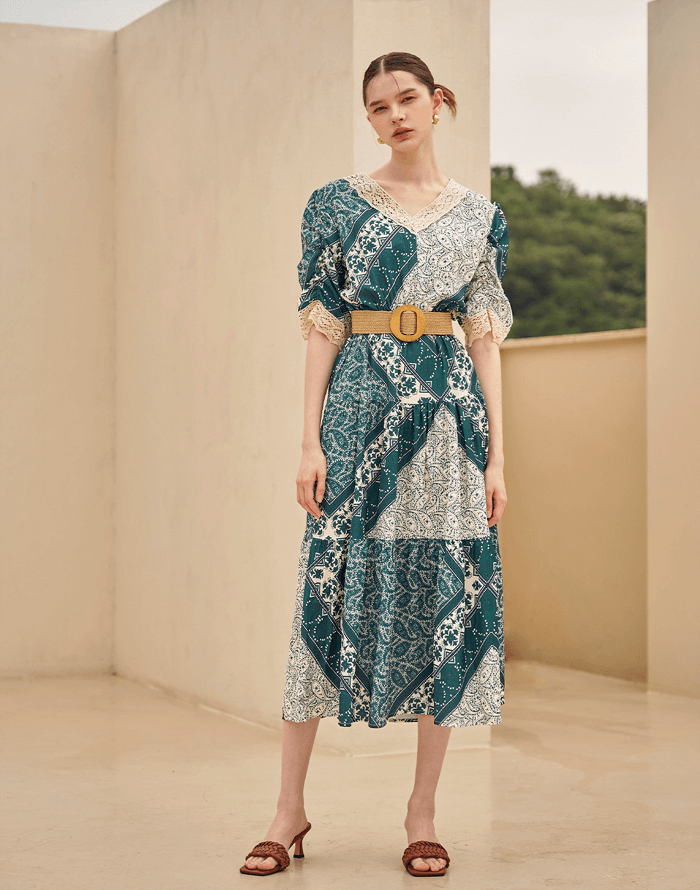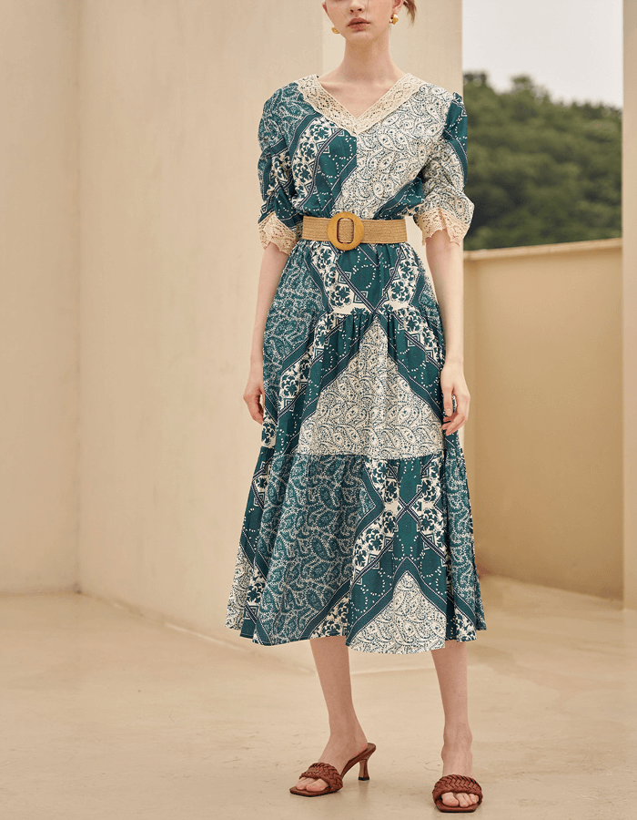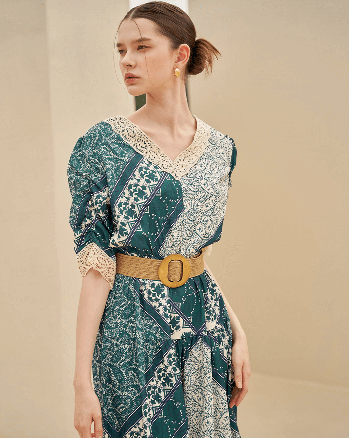 레이스 브이넥 그린 페이즐리 벨트세트 원피스